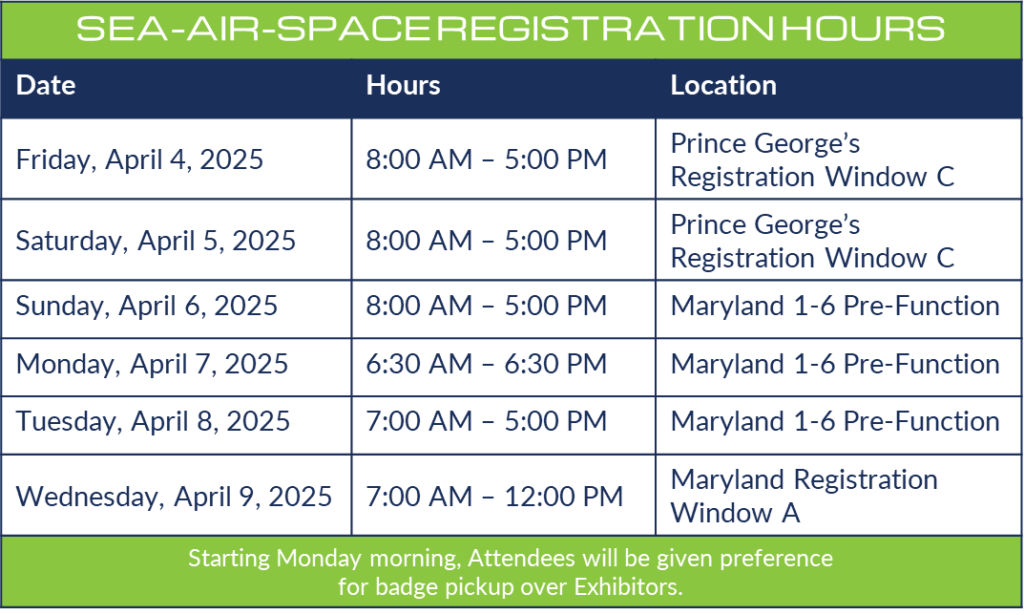 All attendees must display an official Sea-Air-Space badge at all times while at the event. Badges will not be mailed in advance.